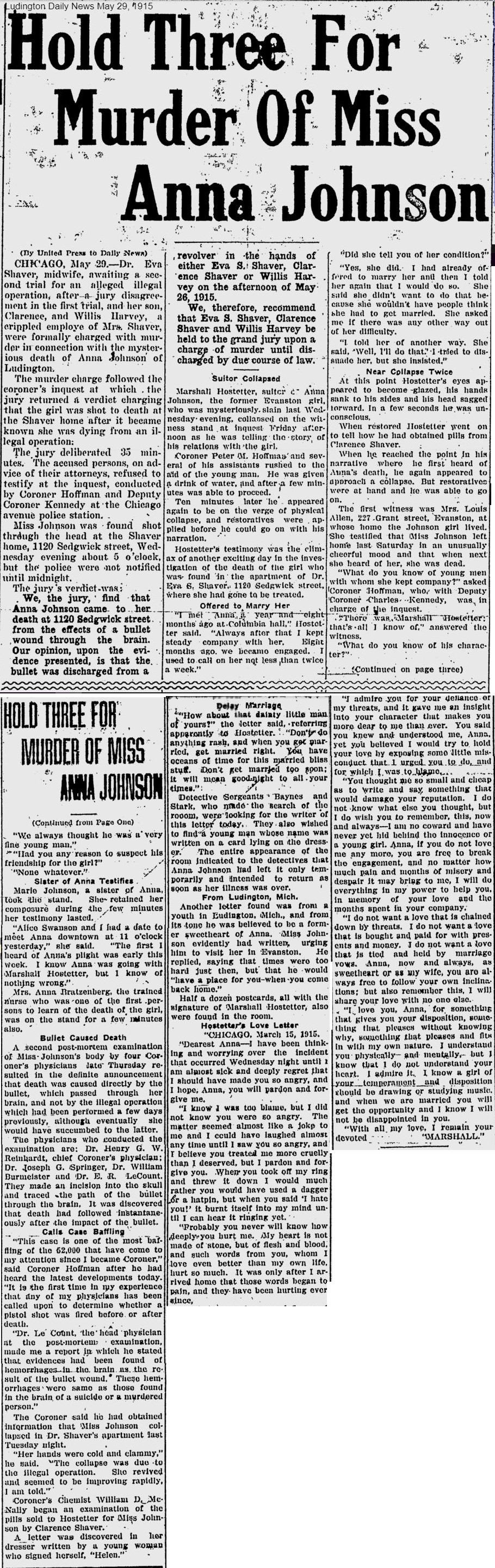 - "Hold Three For Murder Of Miss Anna Johnson," Ludington (MI) Daily News, May 29, 1915