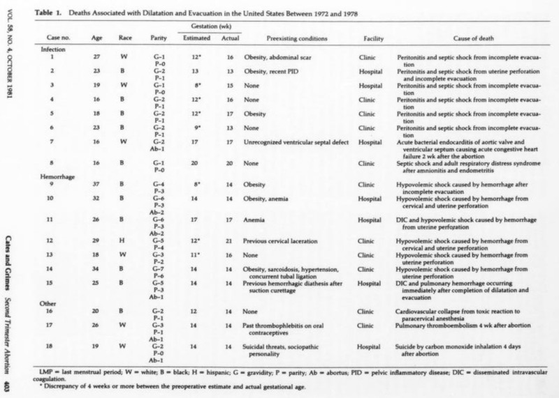 A study on second-trimester D&E abortions (done by dismembering the unborn baby inside the uterus and forcibly extracting each piece) reported many maternal deaths, including three 16-year-old girls killed between 1972 and 1978. Their exact dates of death are not given, and all were at higher risk of death for factors outside of their control.
